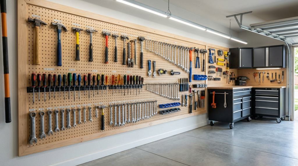 Los paneles perforados o pegboards son la solución más versátil para colgar herramientas en la pared. Permiten visualizar todo el inventario de un vistazo y acceder rápidamente a cada herramienta. Los ganchos y soportes ajustables se adaptan a diferentes tipos de útiles, desde destornilladores hasta llaves y martillos.